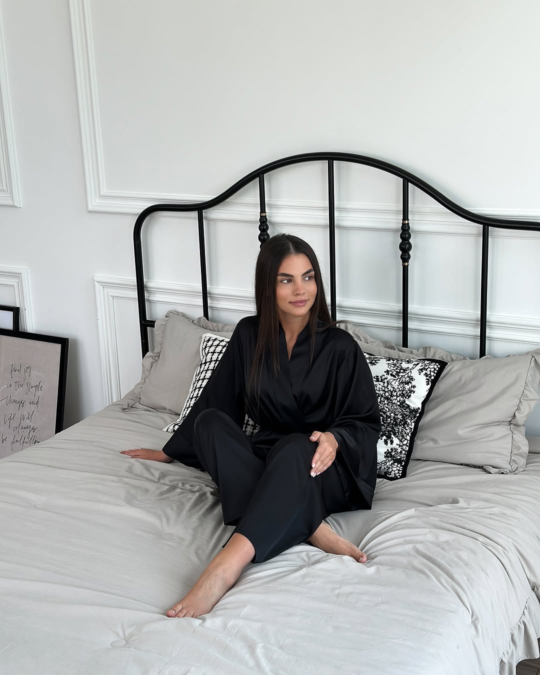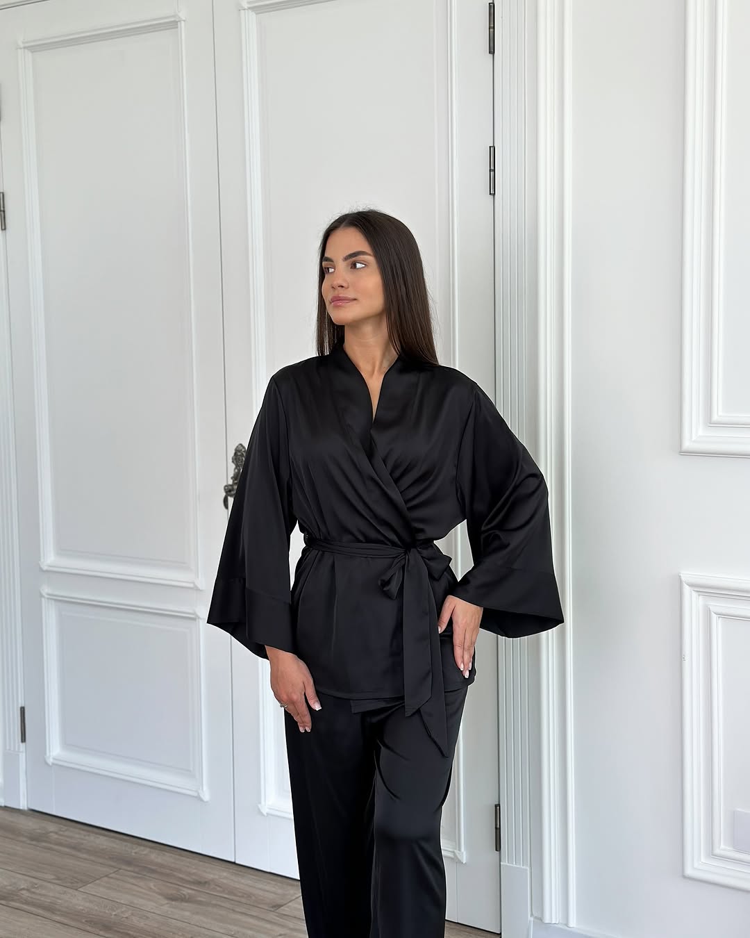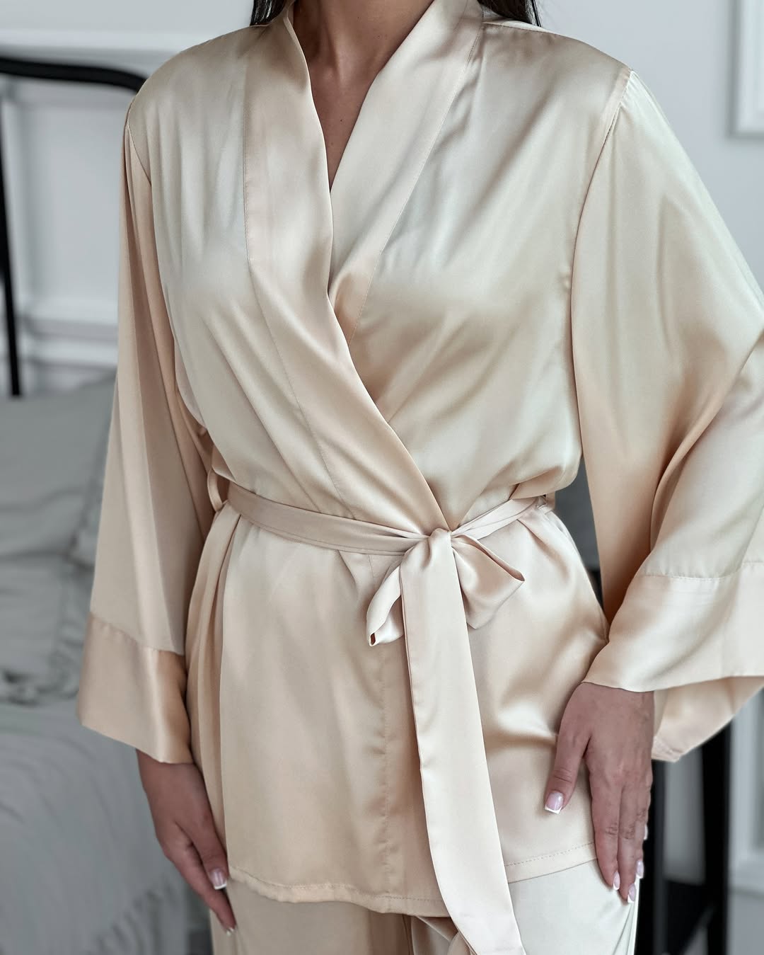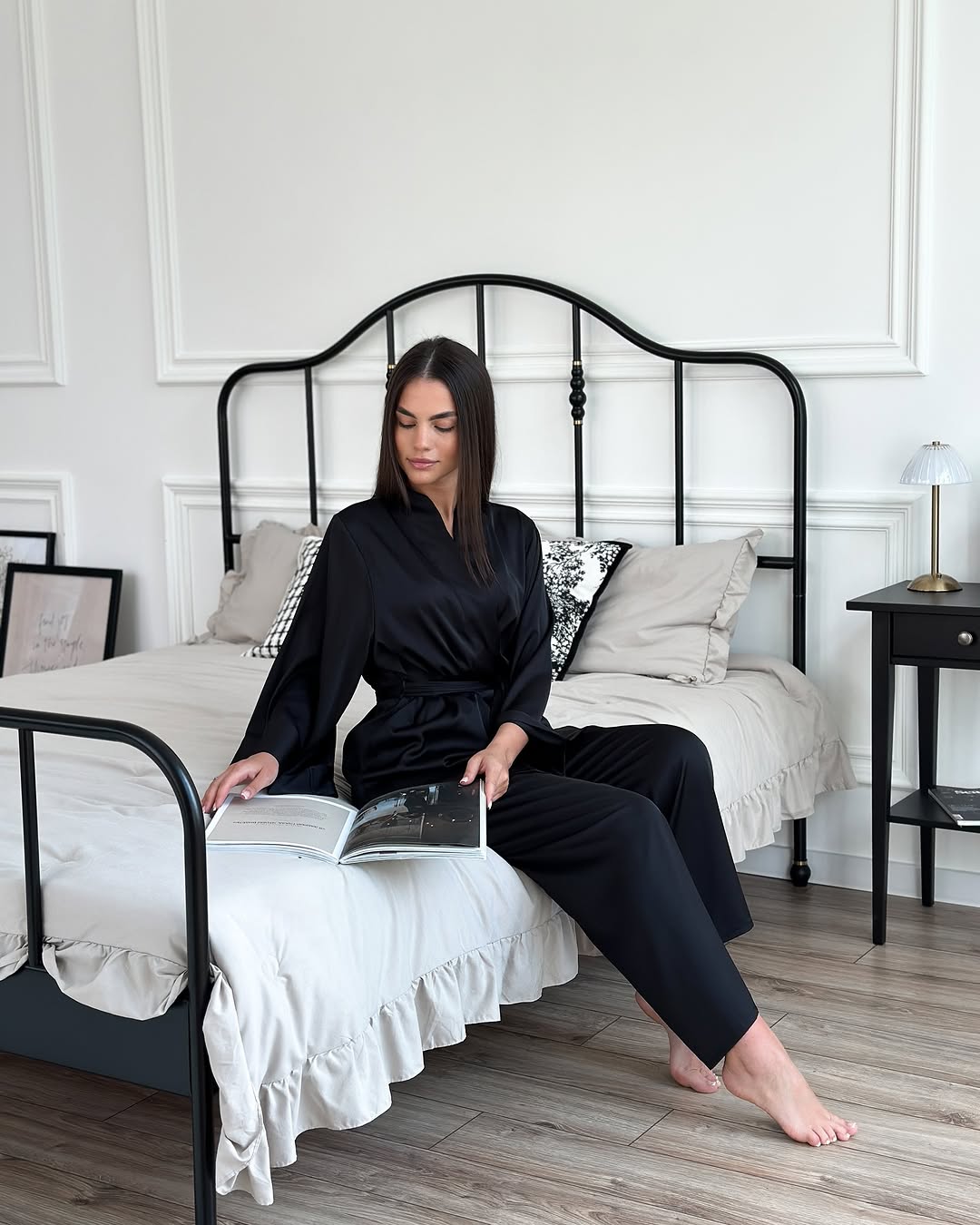 Kimono satin de soie haute qualité + Pantalon assorti en satin de soie avec détails élégants + Coffret cadeau raffiné + Sac de luxe inclus + Carte de fidélité : Profitez de réductions exclusives sur votre prochaine commande !